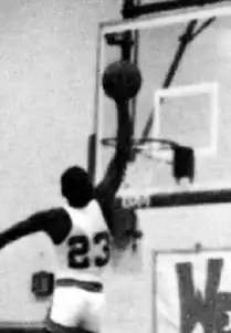 Jordan going in for a slam dunk for the Laney High School varsity basketball team, c. 1979–80