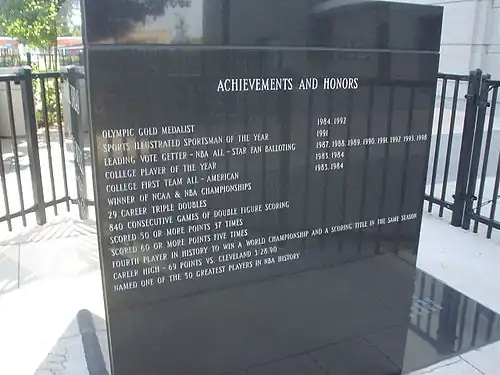 Jordan's individual accolades include six NBA Finals Most Valuable Player (MVP) awards, ten NBA scoring titles (both all-time records), five NBA MVP awards, 10 All-NBA First Team designations, nine All-Defensive First Team honors, fourteen NBA All-Star Game selections, three NBA All-Star Game MVP awards, three NBA steals titles, and the 1988 NBA Defensive Player of the Year Award.[14] He holds the NBA records for career regular season scoring average (30.1 points per game) and career playoff scoring average (33.4 points per game).[17] He is one of only eight players to achieve the basketball Triple Crown. In 1999, Jordan was named the 20th century's greatest North American athlete by ESPN and was second to Babe Ruth on the Associated Press' list of athletes of the century.[5] Jordan was twice inducted into the Naismith Memorial Basketball Hall of Fame, once in 2009 for his individual career,[18] and again in 2010 as part of the 1992 United States men's Olympic basketball team ("The Dream Team").[19] He became a member of the United States Olympic Hall of Fame in 2009,[20] a member of the North Carolina Sports Hall of Fame in 2010,[21] and an individual member of the FIBA Hall of Fame in 2015 and a "Dream Team" member in 2017.[22][23] Jordan was named to the NBA 50th Anniversary Team in 1996 and to the NBA 75th Anniversary Team in 2021.[24] The trophy for the NBA Most Valuable Player Award is named in his honor.