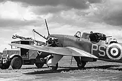 In May, No. 264 was switched to offensive work, carrying out intruder sorties to German-occupied France.[3] On the night of 8/9 May Young, still paired with Russell, shot down a Bf 110 over the airfield at Merville.[5] A few months later, Young was attached to No. 1422 Flight, which was experimenting with Hawker Hurricane fighters working in combination with Turbinlite Douglas Havocs.[5]