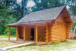 The reproduction of the 1830 Settlers Cabin was the fifth stop on the half-mile trail loop. Interpreters showed what life was like in this time period. One example is the spinning of wool that is sometimes demonstrated by an interpreter on the front porch of the cabin. Other work involved was churning butter, making candles, and grinding coffee grounds.[32]