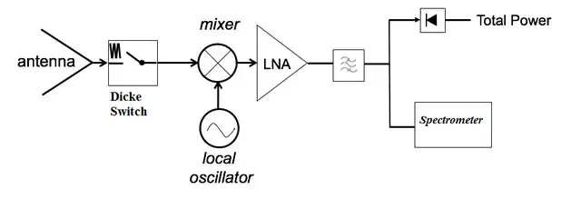 The key element is the Dicke switch, which alternately switches between the antenna and a cryogenic load at a known temperature. A calculation from the change in noise level, gives the sky temperature.