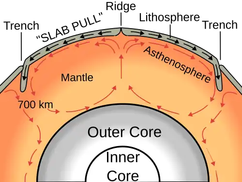 The oceanic lithosphere is formed at an oceanic ridge, while the lithosphere is subducted back into the asthenosphere at ocean trenches. Two processes, ridge-push and slab pull, are thought to be responsible for spreading at mid-ocean ridges.[24] Ridge push refers to the gravitational sliding of the ocean plate that is raised above the hotter asthenosphere, thus creating a body force causing sliding of the plate downslope.[25] In slab pull the weight of a tectonic plate being subducted (pulled) below an overlying plate at a subduction zone drags the rest of the plate along behind it. The slab pull mechanism is considered to be contributing more than the ridge push.[24][26]