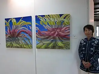 Her first exhibitions were in Japan and Granada, Spain, starting in 1971. These shows were held in venues such as the Muromachi Gallery, the Kesennuma Cultural Center and the Hamada Annex in Japan as well as the Centro Artístico in Granada twice.(cv) In 1993, her first show in Mexico was at the Mexico-Japan Association in Mexico City, where she has exhibited over eighteen times to date. From that time to the present, she has had individual exhibitions at the Instituto Michoacano de Cultura in Morelia, the Kahohu-Kesennuma Exhibition Hall, the Casa de Cultura in Tlalpan, the municipal palace of Naucalpan, the Centro Asturiano and the San Juan Bautista Museum in Japan. In 2012, she exhibited 24 works as “El silencio de movimiento at UNAM’s Centro Cultural Acatlán.[1][6] She has also had numerous group showings, recently concentrating on exhibitions with the Flor de Maguey group.[1][7] This is Mexican-Japanese artist group which also includes along Shino Watabe, Shoko Sumi and Beatriz Lazo. The group exhibits together, creating works related to the themes related to the culture of both countries.[8]
