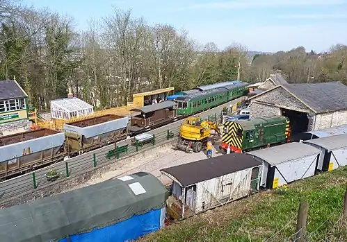 Today the trust runs an operational railway centre and museum at the site, and are relaying the 2 miles 2 chains (3.3 km) of track southwards up the gradient towards Chilcompton.[10][11] The plan is to eventually operate a ride-round trip over the route, which would require restoration of the former Chilcompton railway tunnel.[12] A road bridge over the railway, north east of the station has been removed, therefore relaying track on this side of the station would be expensive.