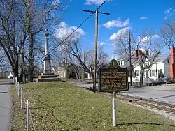 2. ^ Jean Rouse; Daniel Kidd (April 1978). "National Register of Historic Places Inventory/Nomination: Midway Historic District". National Park Service. Retrieved March 9, 2018. The McKee Monument (see photo 12 and site 30) honors William R. McKee, the chief engineer of the Lexington and Ohio Railroad. "Due to his efforts the second regiment of the Kentucky volunteers was mustered and he was made their captain. In the battle of Buena Vista, after leading his regiment to victory, he was fatally wounded. " (A History of Midway, p. 31). The monument, dedicated by Midway citizens on July 4, 1847, consists of a fluted column surmounted by an urn. The inscription on the plinth was composed by Theodore O'Hara, McKee's First Lieutenant who is renowned for having written a famous poem, "The Bivouac of the Dead". With 49 photos from 1977-78 (McKee Monument in photo #12) .