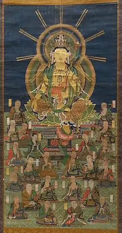 In Japanese Buddhism, mikkyō (密教, from himitsu bukkyō, literally "secret Buddhism"), or Japanese Esoteric Buddhism, is the lineage of Vajrayana transmitted to Japan, primarily in the early Heian by Kūkai, and to a later extent by Saichō and his successors such as Ennin. It consists of complex systems of icons, meditative rituals, and ritual languages; distinct from the exoteric (kengyō, 顕経) schools.[1][2]