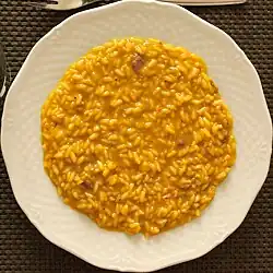 Risotto alla milanese, a saffron-infused dish, is Milan’s iconic first course, prepared with Carnaroli rice, bone marrow, butter, and grated cheese.[29] Numerous regional variants incorporate local ingredients, such as luganega sausage, pumpkin, mushrooms, or gorgonzola, reflecting the diversity of Milanese agriculture.[note 2]