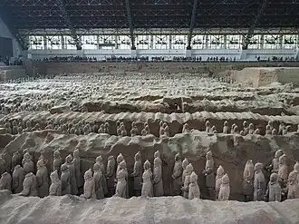 There is no agreed upon starting point for the Warring States period. According to one definition, it began in 481 BC when the House of Tian eliminated the House of Jiang and usurped the throne of Qi.[15] Another defines the start as the Battle of Jinyang in 453 BC when the lords of Han, Zhao, and Wei eliminated the Lord of Zhi, thereby becoming the most powerful families in the state of Jin.[16] Although the Usurpation of Qi by Tian and Partition of Jin are the two most salient political events used to determine the boundary between the two halves of the Eastern Zhou, other starting points for the Warring States period include the death of Confucius in 479 BC, the accession of King Yuan of Zhou in 476 or 475 BC, or the formal recognition by King Weilie of Zhou of the rulers of Han, Zhao, and Wei as vassal lords in 403 BC.[17] Not all historians will accept a single year as a clean cutoff date,[18] and some will choose arbitrarily.[19]
