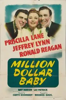 Million Dollar Baby is a 1941 American romantic comedy film directed by Curtis Bernhardt and starring Priscilla Lane, Jeffrey Lynn, Ronald Reagan, May Robson and Lee Patrick.[1][2] The film was based on a short story by Leonard Spigelgass. It was produced and distributed by Warner Bros.