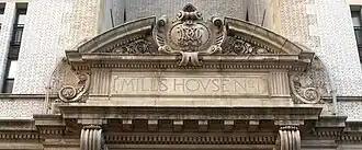 Mills House No. 1 is one of two survivors of three men's hotels built by banker Darius Ogden Mills in New York City (the other being Mills House No. 3).[1] It originally contained 1,554 tiny rooms (7 and a half by 6 feet or 5 by 8 feet) that rented at the affordable rate of 20 cents a night, with meals costing 15 cents,[2][3] The rooms contained only a bed with a mattress and two pillows, one stuffed with hair, the other with feathers, a chair and a clothes rack, and their walls stopped about a foot short of the ceiling. There were four toilets and six washbasins on each floor (for 162 rooms) and bathrooms on the ground floor.[4]