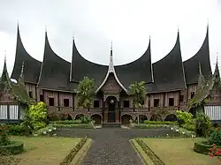 The traditional house of the Minangkabau people, is called Rumah Gadang. The rumah Gadang is usually built on a plot of land belonging to the parent family in the tribe and people from generation to generation.[7] Not far from the rumah gadang complex is usually also built a surau that functions as a place of worship and a place of residence for unmarried adult men. The rumah gadang is made in the form of a rectangle and is divided into two front and rear parts, generally made of wood, and at first glance it looks like a stilt house with a distinctive roof, prominent like a buffalo horn, the local people call it Gonjong and the roof was formerly made from palm fiber before changing to a zinc roof.[8] This rumah Bagonjong according to the local community was inspired by the Tambo, which tells of the arrival of their ancestors by boat from the sea. Another distinctive feature of this traditional house is not using iron nails but using wooden pegs, but strong enough as a binder.[9][10]