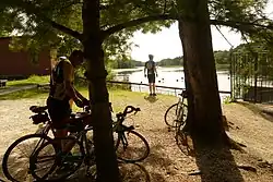 Cyclists take a break at the 1886 Mine Falls Gatehouse in Mine Falls Park.
