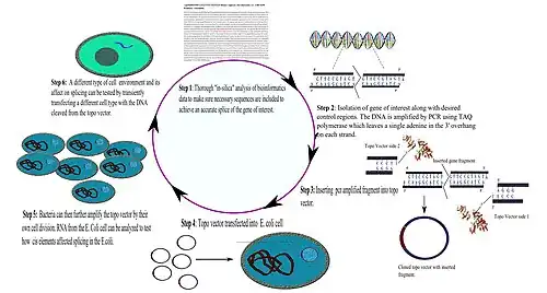 Once a suitable genomic fragment is chosen (Step 1), the exons and introns of the fragment can be inserted and amplified, along with the flanking constitutive exons and introns of the original gene, by PCR. The primers for PCR can be chosen so that they leave "sticky ends" at 3' sense and anti-sense strands (Step 2). These "sticky-ends" can be easily incorporated into a TOPO Vector by ligation into a commercially available source which has ligase already attached to it at the sight of incorporation[10] (Step 3). The subsequent TOPO Vectors can be transfected into E.coli cells (Step 4). After incubation, total RNA can be extracted from the bacterial colonies and analyzed using RT-PCR to quantify ratios of exon inclusion/exclusion (step 5). The minigene can be transfected into different cell types with various splicing factors to test trans-acting elements (Step 6). The expressed genes or the proteins they encode can be analyzed to evaluate splicing components and their effects via a variety of methods including hybridization or size-exclusion chromatography.[1][2]