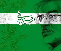 In the 2009 presidential election, Mousavi ran as an independent reformist candidate.[1] Although he was one of the original founders of the Iranian reformist camp, he shared many conservative principles. Many reformist parties, including Khatami's Islamic Iran Participation Front, supported his candidacy after Khatami withdrew from the race.[2] However, other supporters of the reformist movement objected to Mousavi's candidacy, arguing that he was not committed to the principles of the reformist parties.[3] Although Mousavi stated he was not running as a reformist, he indicated that he welcomed the support of various parties, both reformist and conservative.[4]