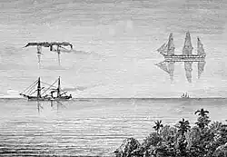 In the same way, ships that are so far away that they should not be visible above the geometric horizon may appear on or even above the horizon as superior mirages.[5] This may explain some stories about flying ships or coastal cities in the sky, as described by some polar explorers. These are examples of so-called Arctic mirages, or hillingar in Icelandic.