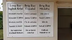 A timetable for a branch of the Jehovah's Witnesses on Big Corn Island in Inglish Kriol, Spanish and Miskitu
