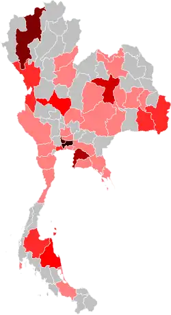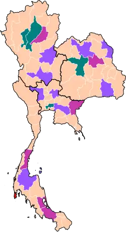 Buriram,[41] Chachoengsao,[42] Chaiyaphum,[43] Chanthaburi,[44] Kanchanaburi,[45] Lopburi,[46] Maha Sarakham,[47] Nakhon Ratchasima,[48] Nong Khai,[49] Phetchaburi,[50] Phitsanulok,[51] Phra Nakhon Si Ayutthaya,[52] Phuket,[53] Prachuap Khiri Khan,[54] Ratchaburi,[55] Rayong,[56] Roi Et,[57] Samut Prakan,[58] Songkhla,[59] Trat,[60] Udon Thani,[61] Uttaradit,[62] Yasothon[63]