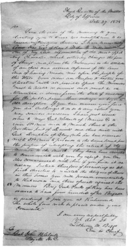Sir: Since the order of this morning to you, directing you to cause four hundred mounted men to be raised within your division, I have received by Amos Reese, Esq., of Ray county, and Wiley C. Williams, Esq., one of my aids [sic], information of the most appalling character, which entirely changes the face of things, and places the Mormons in the attitude of an open and avowed defiance of the laws, and of having made war upon the people of this state. Your orders are, therefore, to hasten your operation with all possible speed. The Mormons must be treated as enemies, and must be exterminated or driven from the state if necessary for the public peace—their outrages are beyond all description. If you can increase your force, you are authorized to do so to any extent you may consider necessary. I have just issued orders to Maj. Gen. Willock, of Marion county, to raise five hundred men, and to march them to the northern part of Daviess, and there unite with Gen. Doniphan, of Clay, who has been ordered with five hundred men to proceed to the same point for the purpose of intercepting the retreat of the Mormons to the north. They have been directed to communicate with you by express, you can also communicate with them if you find it necessary. Instead therefore of proceeding as at first directed to reinstate the citizens of Daviess in their homes, you will proceed immediately to Richmond and then operate against the Mormons. Brig. Gen. Parks of Ray, has been ordered to have four hundred of his brigade in readiness to join you at Richmond. The whole force will be placed under your command.