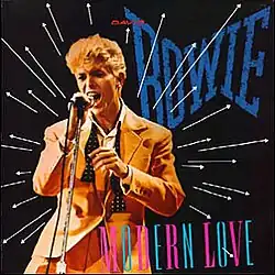 "Modern Love" was released on 14 April 1983 as the opening track of Let's Dance.[11] It was later released on 12 September 1983 by EMI America on seven-inch vinyl (as EA 158, featuring the shortened single version), and on twelve-inch vinyl (as 12EA 158, featuring the full length song) as the third single of the album,[12] with a live version, recorded in Montreal in July 1983,[7] as its B-side.[13] The single reached number two on the UK Singles Chart and number 14 on the US Billboard Hot 100.[14] By the time "Modern Love" was issued as a single, Bowie's Serious Moonlight Tour was underway.[15]