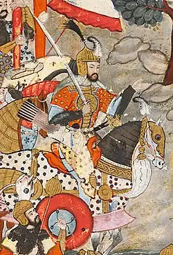 Chagatayid rule in Moghulistan was temporarily interrupted by the coup of the Dughlat Amir Qamar-ud-Din, who likely killed Ilyas Khoja in 1368 and several other Chagatayids. This takeover provoked a period of near-constant civil wars, because the tribal chiefs could not accept that Qamar-ud-Din, a "commoner", could accede to the throne. Opposition to Qamar-ud-Din within his own Dughlat tribe compromised the unity of Moghulistan, as Mirza Abu Bakr Dughlat took control of Kashgar.[2] The Moghuls that remained obedient to him were constantly at war with Timur, who invaded Moghulistan several times but was unable to catch Dughlat invaders.[20] Timur sent at least five victorious expeditions to Moghulistan, seriously weakening Qamar-ud-Din's regime. The Moghuls had sent an unsuccessful supplication to the Hongwu Emperor of China pleading for help, as Tamerlane had also wanted to conquer China,[2] while emphasizing that Transoxiana was the land belonging to their own Moghul forefathers, regarding the Timurids control over Transoxiana as illegitimate.[21] Although a military alliance did not result, the Ming dynasty opened up caravan trade to Moghulistan, greatly enriching the Moghul rulers who collected zakat (tax) on the lucrative Silk Road trade.[22] This trade ushered in an era of economic and cultural exchange with China, in exchange for the state accepting (what the Ming saw as) tributary status to the Ming.[5]