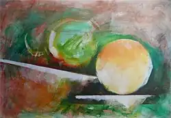 Moje Menhardt lives and works in Weitenegg and Vienna, Austria. She previously lived in Buenos Aires, Rio de Janeiro, Munich, Hamburg, Cologne and Eindhoven.[1] After finishing college, she studied law in Vienna and later painting at the Akademie voor Kunst en Vormgeving St. Joost in 's-Hertogenbosch, Netherlands. She completed her studies at the Academy of Fine Arts Vienna. Meisterschule für Malerei Professor Walter Eckert, 1980 with a diploma.[2][3]