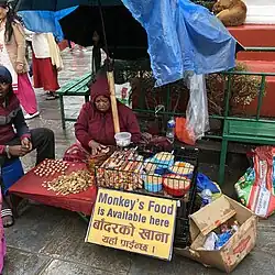 Sign at a store in Swyambhunath, Bagmati, Nepal, which reads "Monkey's Food is Available here". Some places use their monkey population as a tourist attraction.
