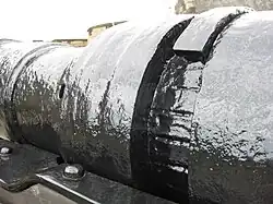 The bombard was manufactured from 25 longitudinal staves of iron, held together with iron hoops shrunk into place, to form one piece.[3][4] A separate breech for loading is screw-fitted into the rear of the barrel.[5] The barrel is attached to the powder chamber by means of a groove on the powder chamber into which lugs on the end of the barrel staves fit, and then bound permanently together by the hoops. The powder chamber itself is made from small pieces of iron hammer-welded together to make a solid wrought-iron forging.[6] Mons Meg has a diameter of 19 inches (480 mm), one of the largest ever built,[2] weighs 15,366 pounds (6,970 kg)[7] and is 13 feet (4.0 m) in length.[8]