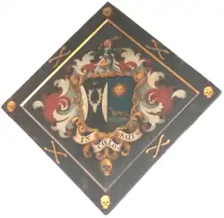 He died in January 1813. There is a will listed for probate in 1814 in Chudleigh.[23] His funeral appears to have taken place at St John's Church, Paignton, then the parish church of his secondary residence at Blagdon, as his funerary hatchment survives in that church, affixed high up on the south wall of the nave. It displays the arms of Parker (with a crescent for the difference of a second son) impaling Azure, a fox statant on grass proper in chief a sun in spendour or (Ourry, the last two words being canting). Above is the crest of Parker: A cubit arm erect vested azure cuffed argent the hand holding a stag's antler proper. Below is the Latin epitaph In Caelo Salus ("Salvation is in Heaven"). Below is a skull. The frame is decorated with skulls and crossbones.[24] The public house in Collaton St Mary (next to Blagdon and also owned by Parker) is called the "Parkers Arms" (sic) after the tenure of the Parker family.[25]
