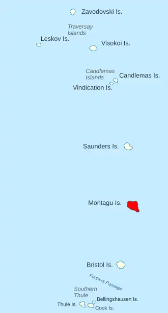 Montagu Island is part of the South Sandwich Islands, a north–south trending chain of islands north of Antarctica and east of the Scotia Sea 2,000 kilometres (1,200 mi) southeast of the Falklands. From north to south they include Zavodovski Island, Leskov Island, Visokoi Island, Candlemas Island-Vindication Island, Saunders Island, Montagu Island, Bristol Island, Bellingshausen Island and Cook Island-Thule Island.[2] Politically, South Georgia and the South Sandwich Islands make up the UK Overseas Territory of South Georgia and the South Sandwich Islands. In 2012, a marine protected area was established in the South Sandwich Islands. The scope of the protected area was further expanded in 2019.[3] Owing to its remoteness, Montagu Island as of 2005 had only been visited four times: In 1930, 1957, 1964 and 1997.[4][5] It was discovered in 1775 by James Cook and initially named "Cape Montagu" as he thought it was a promontory of a larger landmass;[6] Thaddeus von Bellingshausen in 1815 determined that it was actually an island.[7]