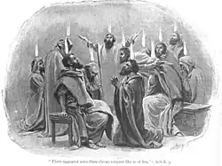 In John's Gospel, Jesus promises to send the Paraclete (Holy Spirit) after his death, from which Montanists believed their prophets derived inspiration. In the Apocalypse, John was taken by an angel to the top of a mountain, upon which he saw the New Jerusalem descend to Earth. Montanus identified this mountain as being located in Phrygia near Pepuza.[41] Followers of the New Prophecy called themselves spiritales ("spiritual people") in contrast to their opponents, whom they termed psychici ("carnal, natural people").[42]