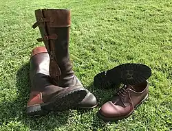 Traditional footwear for "montería española": a pair of Spanish leather boots with fringes (monteras) and a pair of blucher leather shoes with mountain soles (cartujanos)