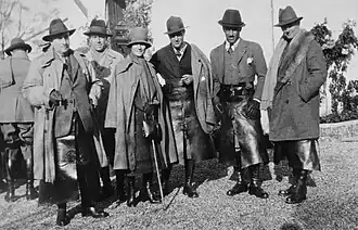 A group of hunters wearing full traditional attire at a montería in Seville, such sophistication being rare nowadays. The 6th Marquess of Alventos is first from the left, Infante Alfonso in the middle and the 8th Count of Yebes next to him, January 1924