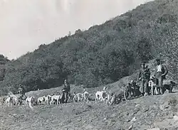 A pair of rehalas and their beaters at a montería in the Sierra de Hornachuelos, 1950