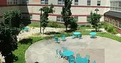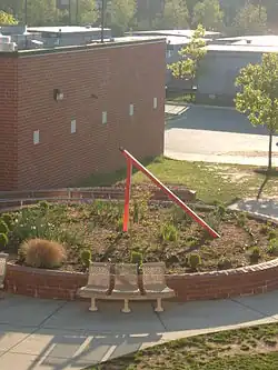 When Montgomery Blair High School's 23.5-acre (95,000 m2) Wayne Avenue campus opened in March 1935, it was the sixth high school in Montgomery County, and the first in the lower county.[6] One of several Montgomery County schools designed during that period by Howard Wright Cutler, the facility then consisted only of the C building, overlooking Sligo Creek. In 1936, the Auxiliary Gymnasium was added, followed by the B building in 1940, and the D building in 1942. MBHS's first football team was founded in 1944, and the War Memorial Stadium opened in 1947.[7] In 1950, the A building was constructed, containing the Blair Library/Media Center. With the addition of the Main Gymnasium/Fieldhouse in 1954, MBHS possessed one of the finest basketball and football facilities in the county.[8] The E building was added in 1959 as an administrative section, followed by the 1969 opening of the 1200-seat auditorium, named for long-time teacher and librarian Elizabeth Stickley.[9] The most recent addition was the automotive shop building in 1973.