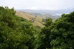 Montgomery Park Scenic Reserve is located in approximately the geographical centre of Banks Peninsula, about 40 kilometres (25 mi) southeast of Christchurch. The small parking area below the reserve is at the crest of the Akaroa Highway that leads from Christchurch to Akaroa Harbour, about 500 metres (550 yd) along the Eastern Bays Summit Road from Hilltop.[1] The reserve is 16 hectares (40 acres) in size, tucked into the southeastern face of a volcanic escarpment facing Akaroa Harbour.[2]