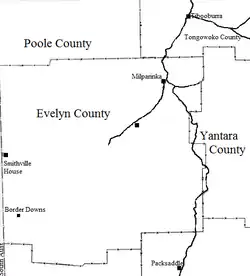 The geography of the Parish is mostly the flat, arid landscape of the Channel Country. The parish has a Köppen climate classification of BWh (Hot desert).[3] The nearest town is Tibooburra to the east, which is on the Silver City Highway and lies south of the Sturt National Park.[4]