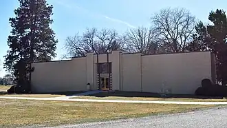 The Morris Hill Cemetery Mausoleum in Boise, Idaho, was designed by Tourtellotte & Hummel and constructed in 1937. The Art Deco, reinforced concrete building includes stained glass windows at the end of each wing, and a central stained glass window is across from a single, bronze door entry. The mausoleum was added to the National Register of Historic Places in 1982.[2]