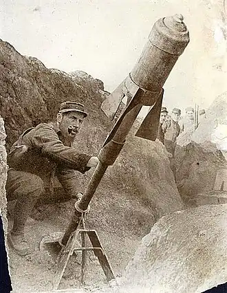 The problem for the French Army was they lacked light, portable, simple, and inexpensive firepower that could be brought with them to overcome enemy machine gun nests and wire entanglements. Early on they experimented with crossbows, catapults, and slingshots to propel hand grenades with limited success. Unlike the Germans the French lacked portable mortars like the 7.58 cm Minenwerfer, 17 cm mittlerer Minenwerfer or 25 cm schwere Minenwerfer. The mortars that the French did have the Obusier de 155 mm C modèle 1881 and Mortier de 220 mm modèle 1880 were siege artillery designed to arm France's forts that were much heavier than their opponents and not designed to be mobile.[4]