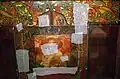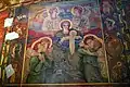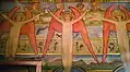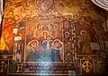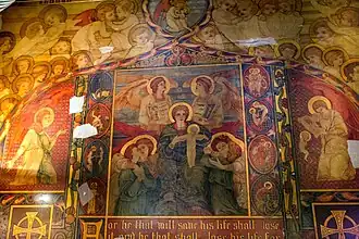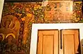 Although the old hospital site had been acquired by the Royal Infirmary of Edinburgh the murals were at risk of slow destruction as the chapel was no longer being used. Then, thanks to a petition led by Traquair herself, in 1894 some of the murals were successfully transported to a new purpose-built mortuary chapel.[5] There were significant technical and logistical difficulties; indeed some of the panels were moved and installed still attached to the bricks of the old building.[2][10] As the new mortuary was larger than the original, panels from the first scheme were repaired, surrounded with fresh plaster, and the spaces filled with an enlarged decoration scheme. Although the two schemes are united by their use of colour, the second scheme deliberately uses a simpler and more childlike manner.[2][7]