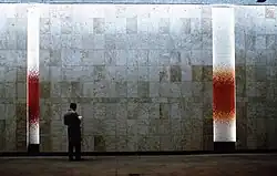 Op art ceramic mosaics together with travertine by Wojciech Fangor in a railway station in Warsaw, Poland (1963)