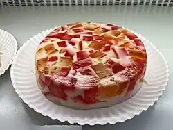 Nevertheless, there is wide variation in how the dish is prepared.[2] The gelatin can have either a water or a milk base.[1] The gelatin itself can be of a single flavor or multiple flavors.[1] The gelatin can have elaborate designs such as flowers, hearts, or butterflies.[1] Sometimes, fresh fruit is added.[4] A bundt pan can be used to mold the gelatin.[4][9]