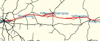 The Moscow–Kazan high-speed railway is a planned 772-kilometre long high-speed railway line connecting the cities of Moscow and Kazan in the Russian Federation, going through the intermediate cities of Vladimir, Nizhny Novgorod and Cheboksary. The project had an original expected completion date of 2018 (as of 2013),[3] and Government of China intended to make the project the first segment of transnational high-speed railway that connect Beijing and Moscow over a distance in excess of 7,000 kilometres.[4] Planning work was finished in September 2017. Preliminary construction on stations and platforms, with space reserved for the railway, started in spring 2018.[5] Construction on the railway has been postponed as of March 2020, due to the high cost (estimated at 1.7 trillion rubles) and in lieu of further studies on ridership.[6] As of 2025, the construction has still not started.