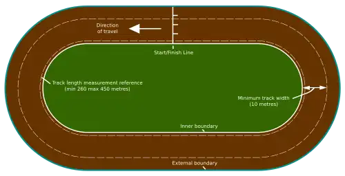 Tracks used for professional speedway racing are regulated by the Fédération Internationale de Motocyclisme (FIM) who provide rules concerning construction, size and safety requirements.[7] Speedway racing takes place on a level oval track consisting of two straights joined by two semicircles. Tracks must be between 260 and 425 metres (853 and 1394 ft) in length, this is measured at a distance of 1 metre (3.3 ft) from the inner boundary. Tracks may be banked, but the gradient must under no circumstances exceed 5% in the straight, 10% in the bends, and must remain constant and grow from the inner edge to the safety fence. A white start line is marked across the track approximately mid-way along one of the straights. The starting area is also divided into four equal parts (known as gates) by white lines marked at right angles to the start line and extending back at least 1 metre (3.3 ft). Additional rules govern the placement of warning systems such as lights and also the construction of the starting mechanism. The minimum track width is 10 metres (33 ft) on the straights and the bends must be at least 14 metres (46 ft) wide. The minimum widths give each rider adequate space to safely navigate the track. The start line and starting gate assembly is halfway along one of the two straight sections of the track. Starting gates are simple spring-loaded mechanisms that raise two or three strands of tape to start the race.[7]