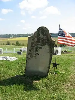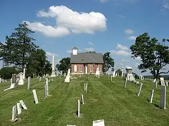 From the Mount Tabor society's earliest years, members buried their dead near the site of the present church. The earliest recorded burial on the site of the church's cemetery is that of a child who died in 1811; at that time, there were no plans to use the ground for religious purposes.[2]: 514 Individuals from many generations since have been buried in the cemetery: among the graves are those of veterans of the American Revolutionary War through World War II. Among the grave markers are three fashioned from cast zinc; these are highly distinctive, for zinc markers were only manufactured for a few years near the end of the nineteenth century.[4]