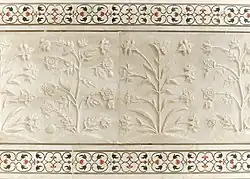 Example of carved flower reliefs on marble and pietra dura (parchin kari) inlaid stonework above and below, at the Taj Mahal