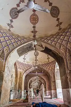 The Wazir Khan Mosque was commissioned by the royal physician Wazir Khan during the reign of the Mughal Emperor Shah Jahan in 1634, and completed in 1642.[33] Considered to be the most ornately decorated Mughal-era mosque,[34] It is well known for its intricate faience tile work known as kashi-kari, as well as its interior surfaces that are almost entirely embellished with elaborate Mughal-era frescoes. The mosque has been under extensive restoration since 2009 under the direction of the Aga Khan Trust for Culture and the Government of Punjab.[35] Wazir Khan also commissioned the Shahi Hammam;[36][37][38] the baths were built to serve as a waqf, or endowment, for the maintenance of the Wazir Khan Mosque.[39]