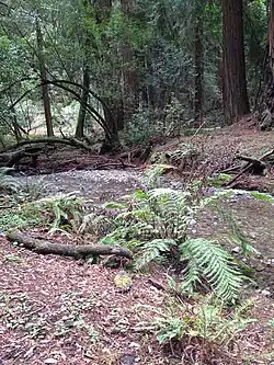 Redwood Creek provides a critical spawning and rearing habitat for coho or silver salmon (Oncorhynchus kisutch) and steelhead (Oncorhynchus mykiss). Steelhead are listed as threatened species (2011) in the Central California Coast distinct population segment. Coho salmon are listed as endangered in their evolutionary significant unit (2011). The creek is near the southernmost limit of coho habitat and the fish have never been stocked, so they have a distinctive DNA. The Redwood Creek salmon are Central Coast coho salmon which have been listed as federally threatened species since October 2006 and as federally endangered species in June 2005. Coho migrate from the ocean back to freshwater for a single chance at reproduction, generally after two years in the ocean. The spawning migrations begin after heavy late fall or winter rains breach the sandbar at Muir Beach allowing the fish to move upstream (usually in December and January).[55] No salmon were seen in the 2007–2008 winter run, nor the 2008–2009 winter run. Evidence points to exhaustion of smolt oversummering in the creek due to a loss of large woody debris and deep pools where young salmon can rest. Starting in 2009, the National Park Service began restoring Muir Beach to create a functional, self-sustaining ecosystem and improve visitor access.[56] The intervention was almost too late, since the coho only has a three-year life span. But, as of January 2010, and for the first time in three years, an estimated 45 coho swam up Redwood Creek to spawn, creating 23 redds or clusters of eggs.[57] In 2011, 11 live adult coho and 1 coho carcass was observed, along with three redds, a modest increase over the 2007–2008 spawning season.[58] Statewide the coho population is 1% of its levels in the 1940s and the fish have vanished from 90% of the streams they formerly visited.[59][60] The Watershed Alliance of Marin reported that no salmon returned to spawn in 2014, prompting concerns that the fish may now be extirpated from the creek.[61]