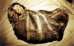 ![]() Mummy Juanita's body before unwrapping of her bundle. | |