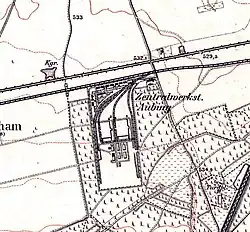About 300 meters to the east, directly south of the Munich-Pasing-Herrsching railroad line, but on the other side of Brunhamstraße, was the Ausbesserungswerk of the Compagnie Internationale des Wagons-Lits, which was later operated by the Deutsche Schlafwagen- und Speisewagengesellschaft and closed in 1999.[1]