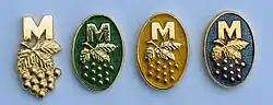 Pins for members of Munskänkarna. Far left a plain member pin with the logo of Munskänkarna, to the right pins for members which have passed the tests for some of the different course levels: 1-betyg ("grade 1") - green, druvbetyg ("grape grade") - yellow, 2-betyg ("grade 3") - blue.